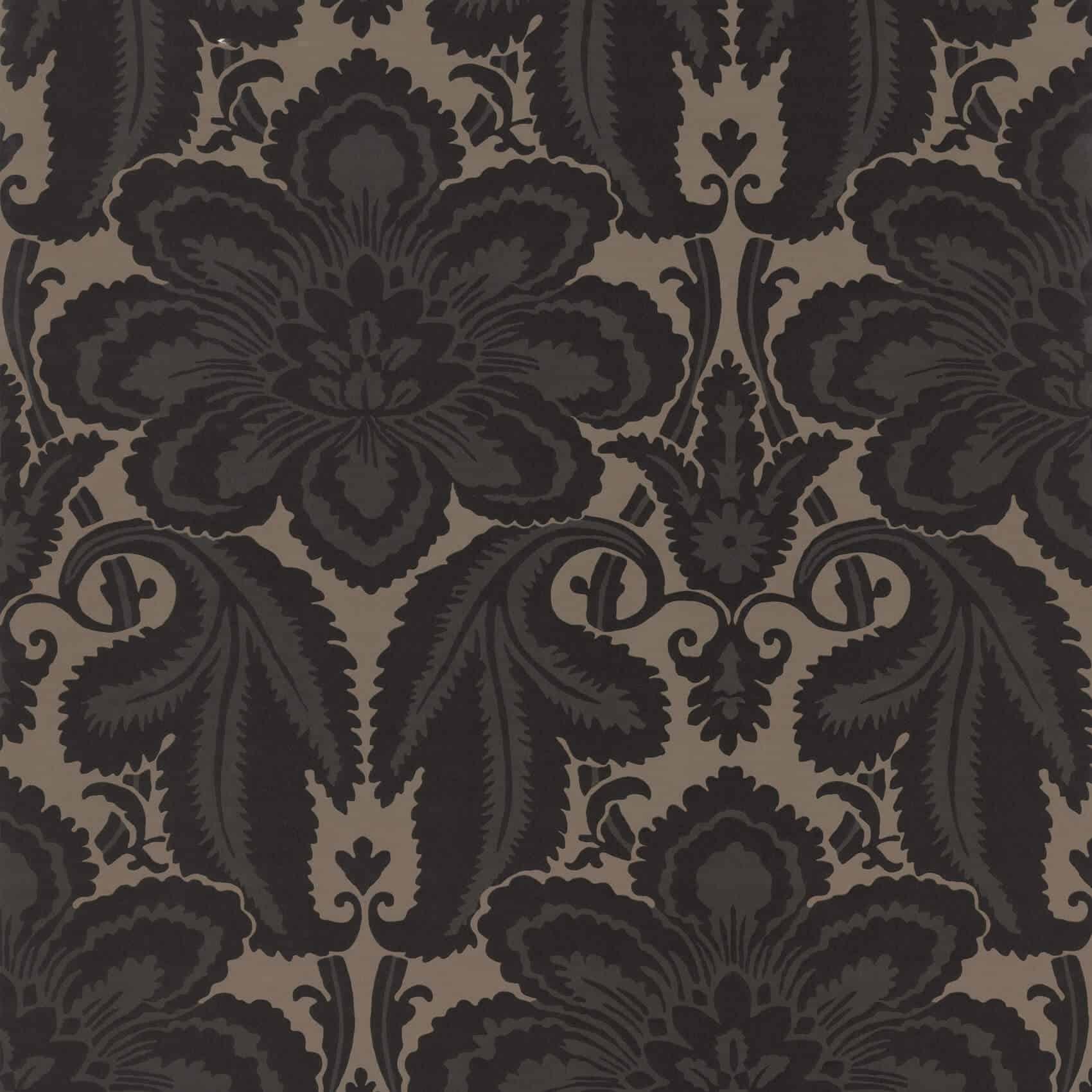 Albemarle St Charcoal Little Greene Wallpaper Reminiscent of Spitalfields silks, this paper, found in Albemarle Street, off Piccadilly, had an enormous pattern repeat of 6ft. Originally produced in a dark blue flock on a light ground, it was unusual to find so bold and expensive a paper used as here, in a low ceilinged, second floor bedroom. Such a grand paper would have been designed to have been on show – more often in a downstairs reception room where guests would be entertained.