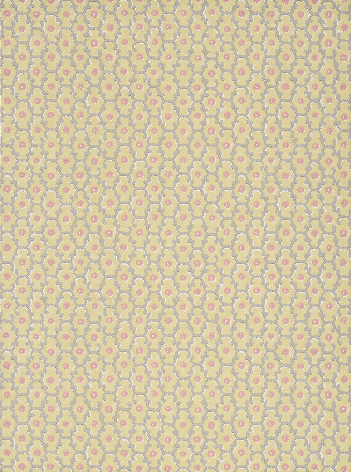 Moy Lime Little Greene Wallpaper Little is known about this small-scale print found at The Argory, just outside Moy in Northern Ireland. The surviving fragment is estimated to be late-19th century in origin, and was printed using diluted watercolours rather than a more conventional, substantial ink or even opaque paint. This slightly broken effect, combined with the shadowing seen within the loose geometric pattern, gives a life to the design that would be difficult to achieve straight from the drawing board.