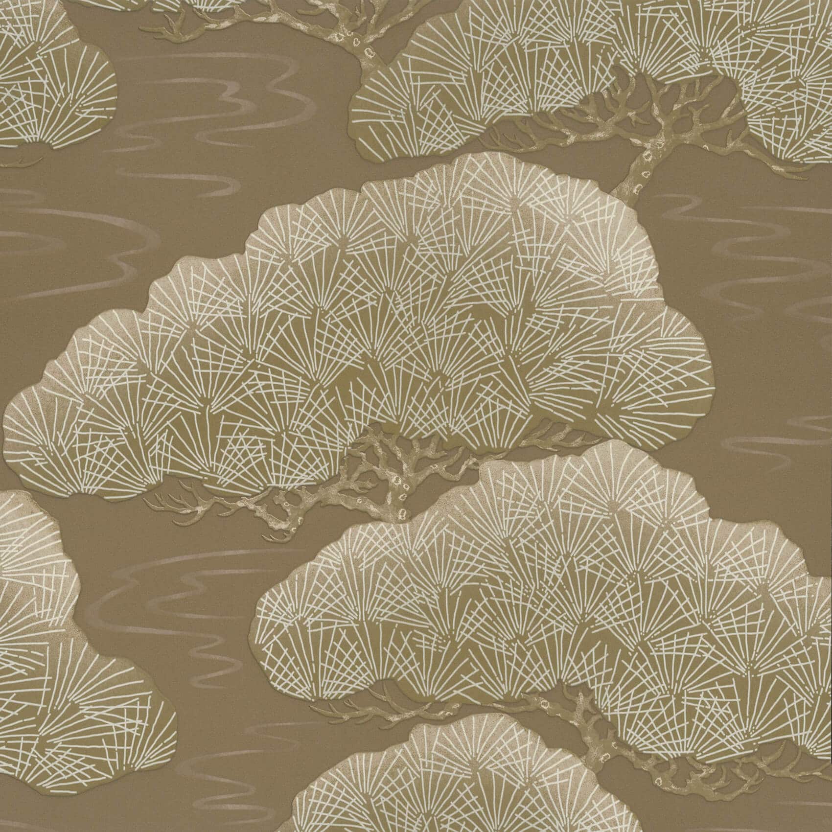 Pines Golden Pine Little Greene Wallpaper Drawn from an early 19th century silk kimono, an abstract depiction of Pine Trees emerging out of the clouds.