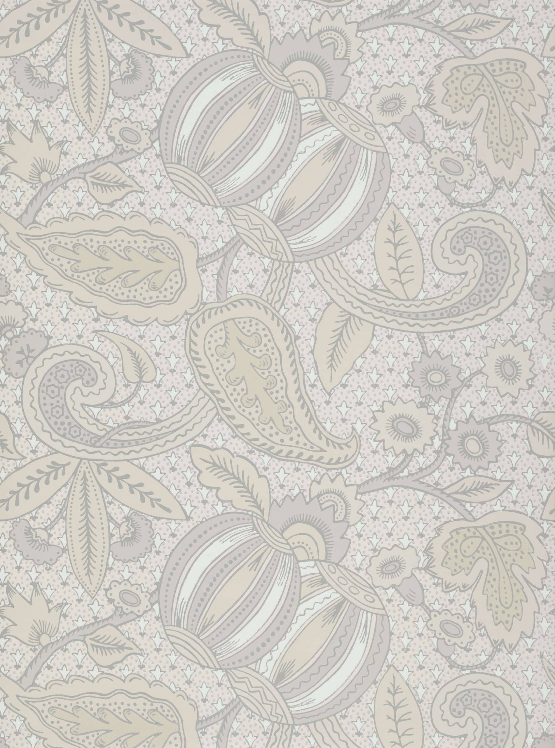 Pomegranate Grey Scale Little Greene Wallpaper A rare and very early find, this Baroque design was uncovered by the National Trust, hiding beneath wall-hung tapestries at Erddig in Wales.