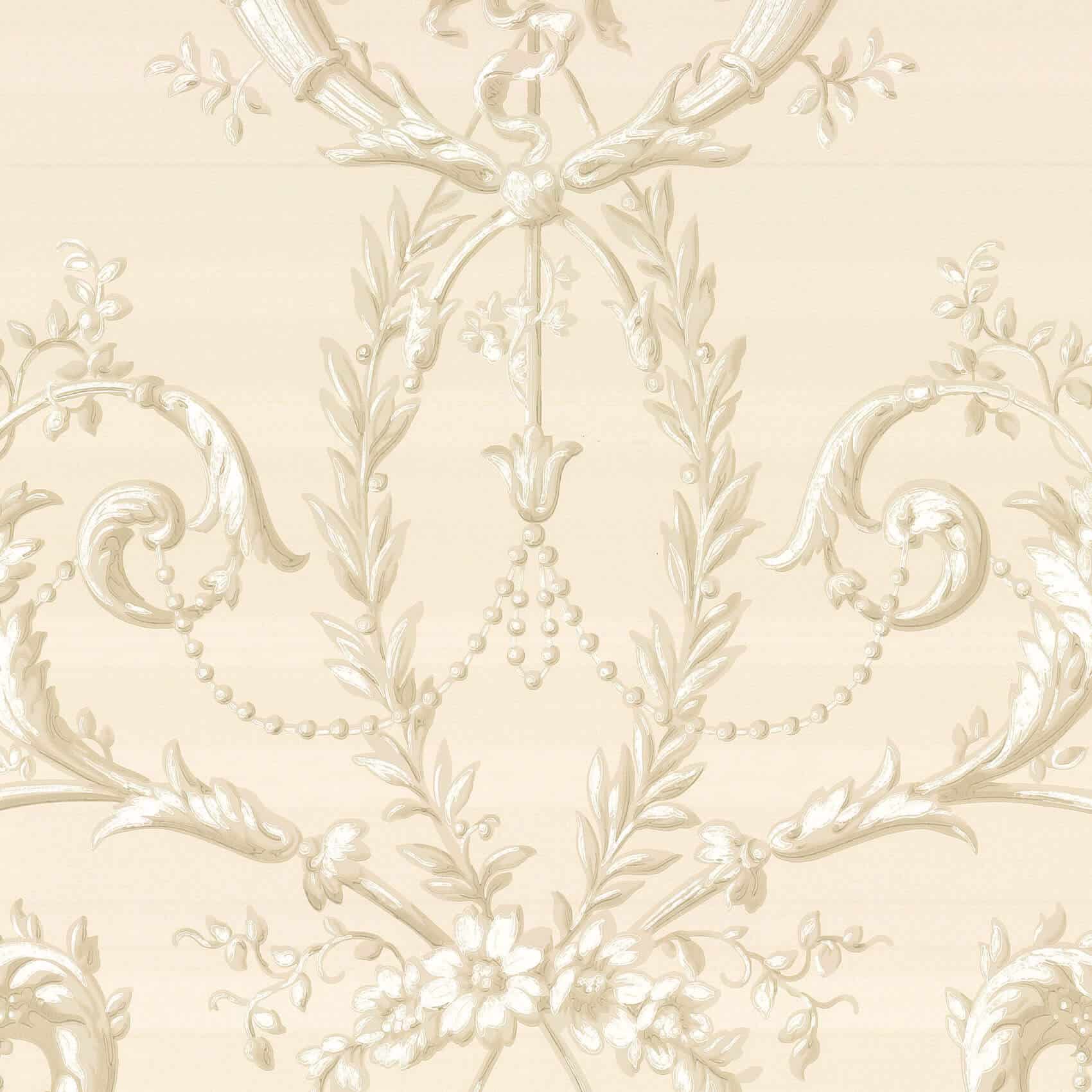 Versailles Dark Pearl Little Greene Wallpaper A slightly later paper than its traditional design might suggest, Versailles is based on an original document which was machine printed in graded tones to give a trompe l’oeil effect. In a classic Rococo style, it features scrollwork and cornucopia bursting with flowers.