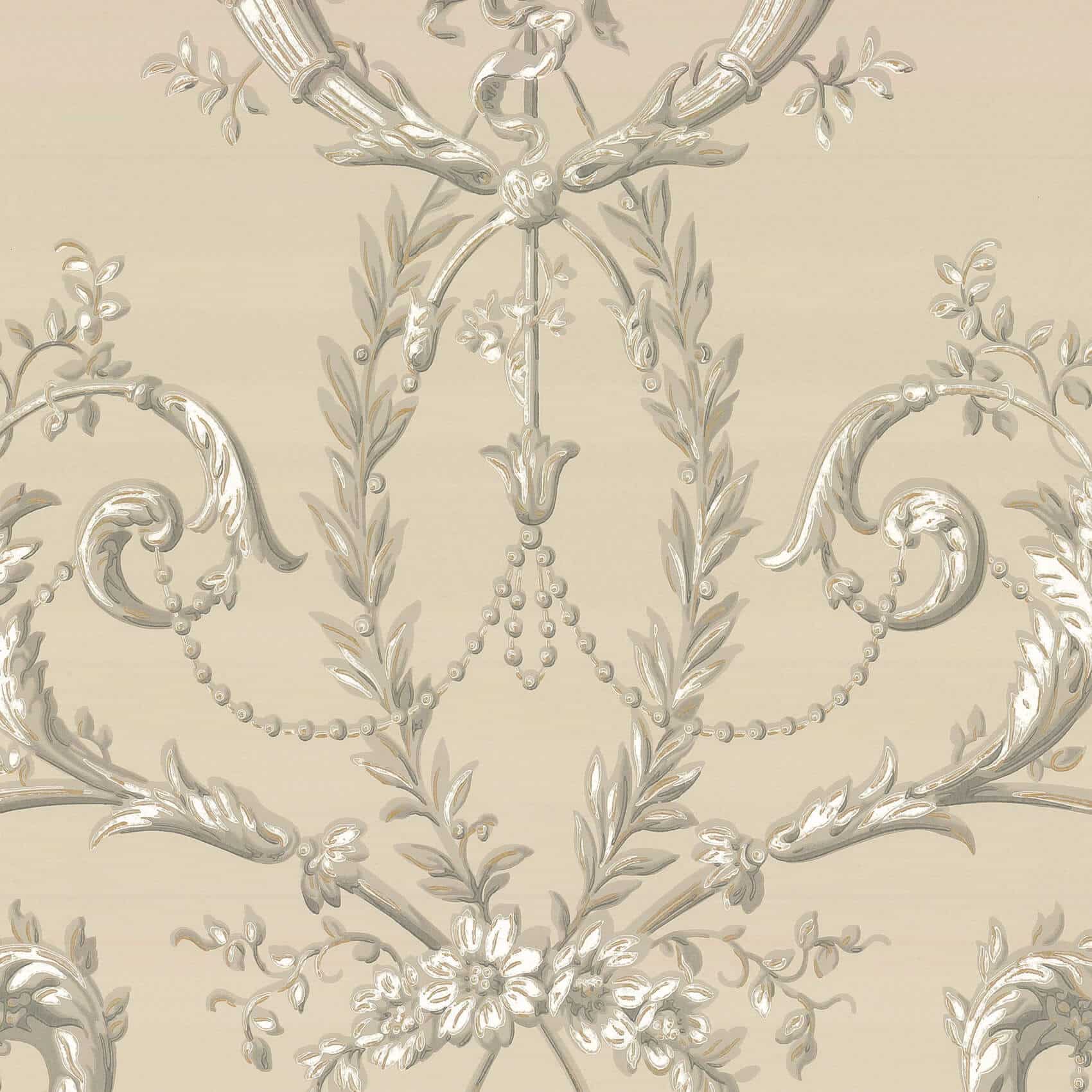 Versailles Guilded Little Greene Wallpaper A slightly later paper than its traditional design might suggest, Versailles is based on an original document which was machine printed in graded tones to give a trompe l’oeil effect. In a classic Rococo style, it features scrollwork and cornucopia bursting with flowers.