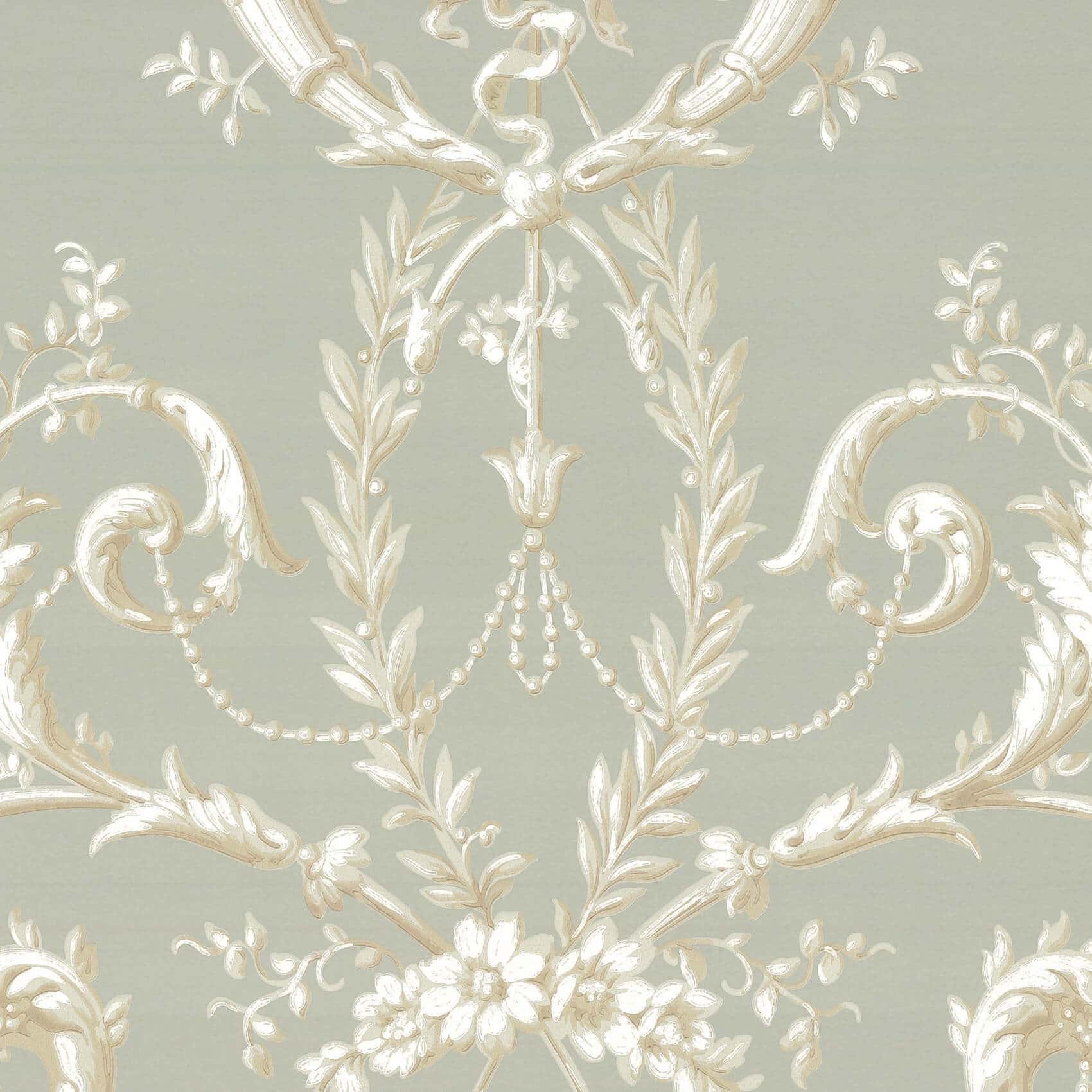 Versailles Monument Little Greene Wallpaper A slightly later paper than its traditional design might suggest, Versailles is based on an original document which was machine printed in graded tones to give a trompe l’oeil effect. In a classic Rococo style, it features scrollwork and cornucopia bursting with flowers.